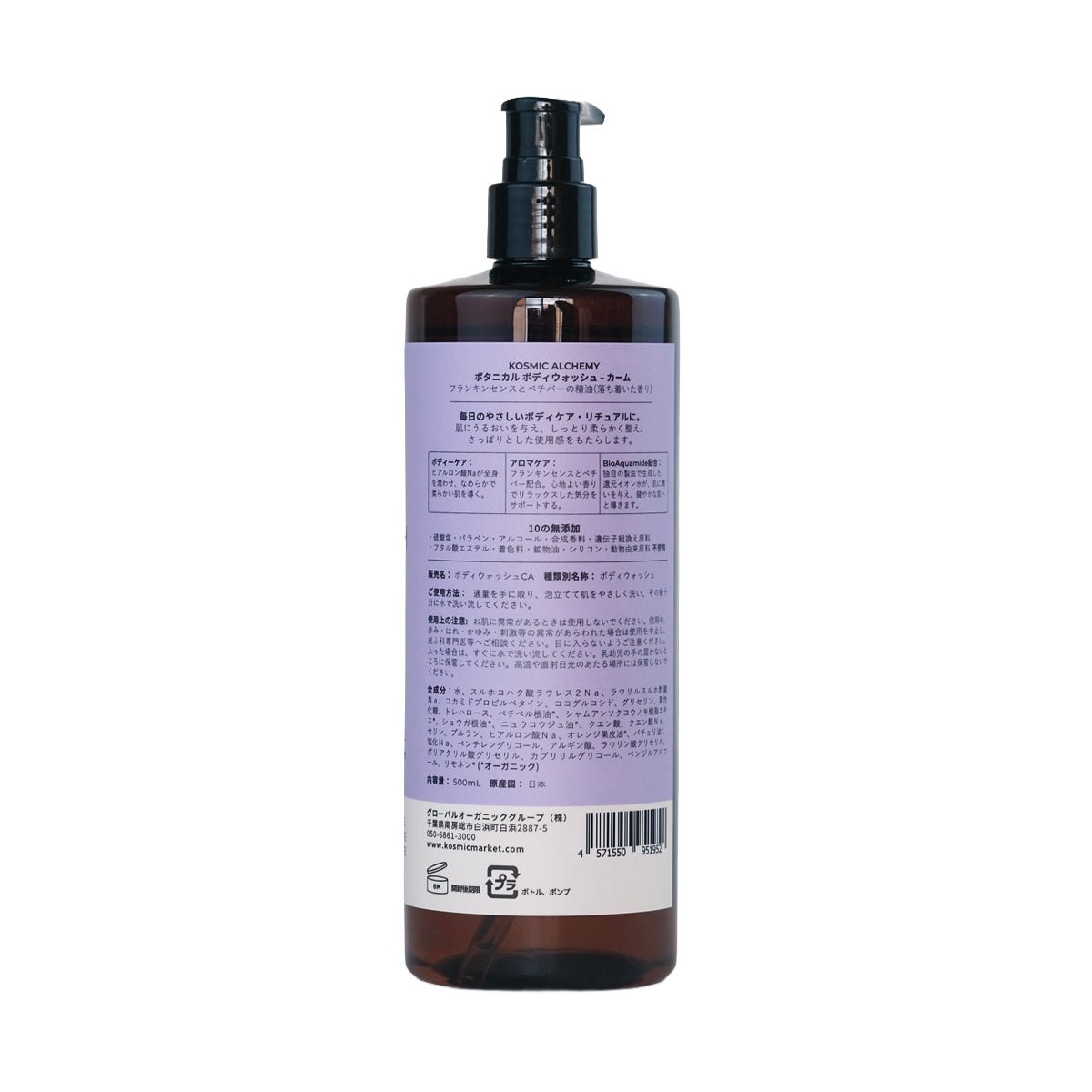 水、スルホコハク酸ラウレス2Na、ラウリルスルホ酢酸Na、コカミドプロピルベタイン、ココグルコシド、グリセリン、サッカライドイソメレート、トレハロース、ベチバー根油*、安息香酸樹脂エキス*、ショウガ根油*、ボスウェリアカルテリガム油*、クエン酸Na、セリン、アルギン酸、カプリリルグリコール、プルラン、ヒアルロン酸Na、オレンジ果皮油*、パチョリ油*、クエン酸、塩化Na、ペンチレングリコール、グリセリルポリアクリレート、リン酸2K、リン酸2Na、グリセリルラウレート、ベンジルアルコール、リモネン* (* オーガニック)